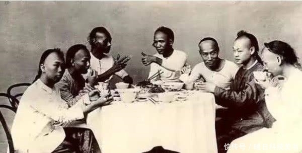 清末一群人围着桌子在吃饭。