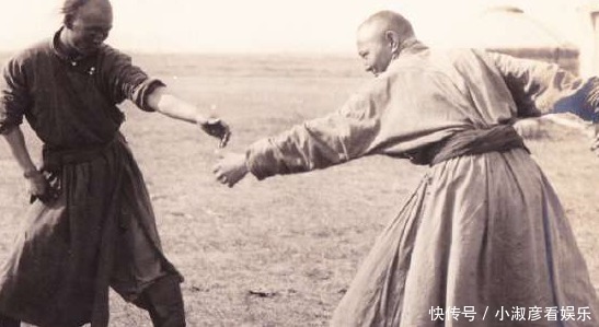 图为清朝末年的两个蒙古男子,这两个男子都看上去很有气势,他们正在玩摔跤。