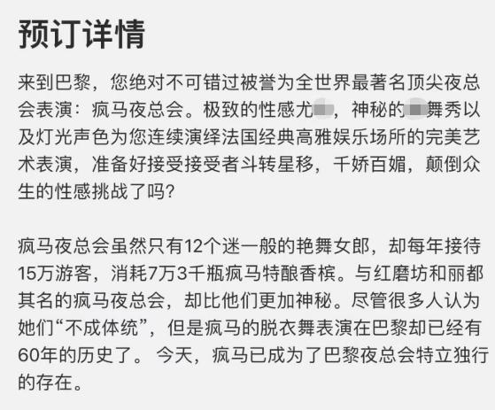 很多人可能不知道"疯马秀"是个什么东西,它是全球最著名且顶尖的夜总会表演秀,以脱衣舞女郎而出名,会所有舞娘12名,但每年的接客量非常大,很多人都慕名而去,尤其是男人,不想错过这场"艺术表演"。