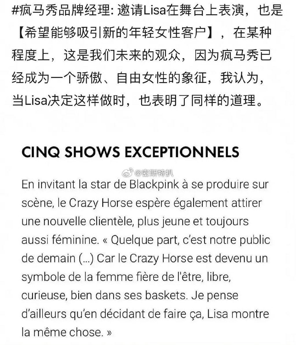而Lisa跟着去看疯马秀就算了,居然还官宣要参加"疯马秀"表演,此消息一出,在网上引起广泛讨论,纷纷表示不敢相信。可是,这个消息是Lisa方自己官宣的,应该不会有无,除非被盗号了。