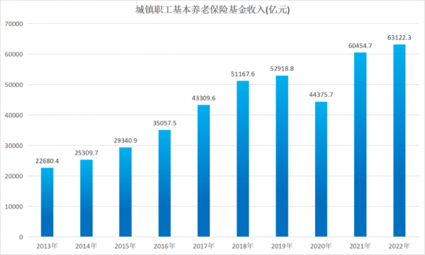 养老基金收入则从2013年的22680.4亿元上升到2022年的63122.3亿元,增幅178.3%。