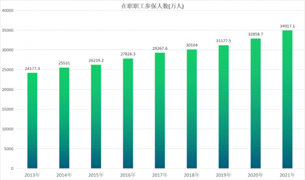 从2013年到2021年,我国在职职工参保人数从24177.3万人上升到34917.1万人,增加了10739.8万人,增幅44.4%。