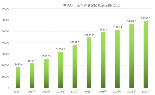 另外从2013年到2022年,我国城镇职工基本养老金支出从18470.4亿元上升到59030.3亿元,增幅219.6%。