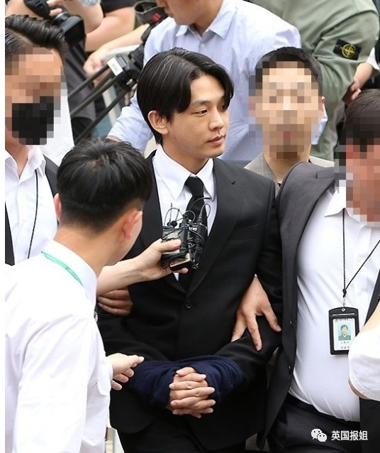 走出警察局的刘亚仁已经被戴上了手铐,为了保护他的隐私手铐上套了一块布。