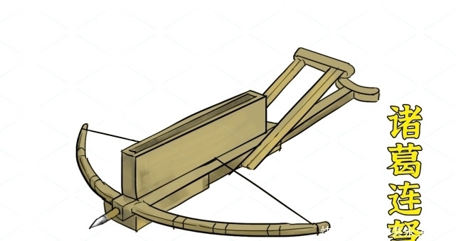 第二件冷兵器--诸葛连弩。相比起陌刀,诸葛连弩的名气更大,因为它的发明者,乃是蜀汉丞相诸葛亮。据《三国志·蜀书·诸葛亮传》注引《魏氏春秋》书中记载:"亮作八务、七戒、六恐、五惧,皆有条章,以训厉臣子。又损益连弩,谓之元戎,以铁为矢,矢长八寸,一弩十矢俱发。"