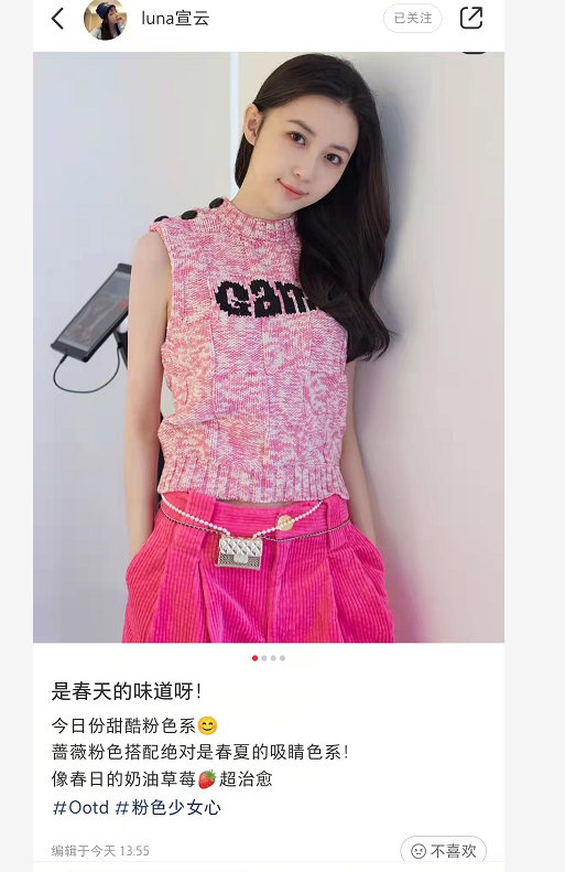 3月20日下午,潘玮柏老婆宣云在个人社交平台分享一组自己的最新美照。此番入镜,宣云开心给大家展示自己的甜酷粉色系穿搭,模样又甜又美,少女感爆棚。