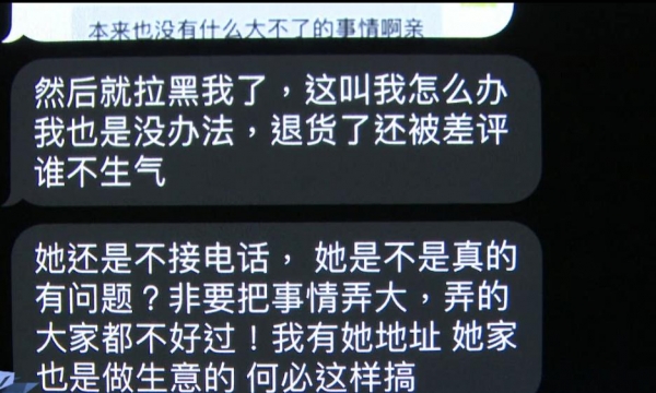记者联系上涉事商家,对方表示自己没打过骚扰电话,但承认了发送辱骂短信。“谁说不退款了,双 11 很忙晚两天嘛,她给什么差评啊 …… 我太生气了我才骂她”,对方还说,自己这么紧张差评是因为会被扣工资。