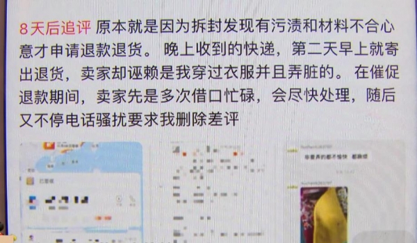 11 月 17 日,周小姐表示她已将此事投诉至淘宝客服。记者看到,周小姐发布的商品差评下,商家回复称是“周小姐试穿后弄脏了衣服,还以各种理由退款”,其中粗俗字眼被系统屏蔽。