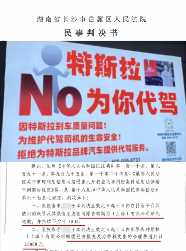 网易汽车2月17日报道 日前,特斯拉起诉某代驾平台司机名誉侵权一案判决结果公布,法院判定被告代驾司机自判决生效之日起十日内在抖音平台其使用的账号及其微信朋友圈向原告特斯拉(上海)有限公司赔礼道歉,并持续不少于30日。赔偿原告经济损失及为维权支出的合理费用共计20000元。