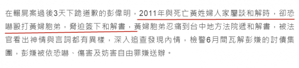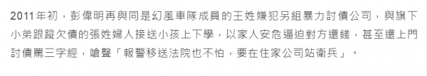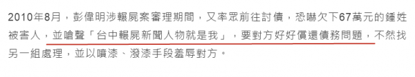 2010年8月,彭伟明涉辗尸案审理期间,又率众前往讨债,恐吓欠下67万元的钟姓被害人,并呛声“台中辗尸新闻人物就是我”威胁对方还钱。