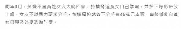 他连自己的女朋友都暴力相待,只因女友回家太晚便持枪胁迫其掌嘴,并拍下录影带放上网。女友不堪暴力要求分手,又被他强迫给45万台币分手费,还以此威胁女友母亲和外婆。