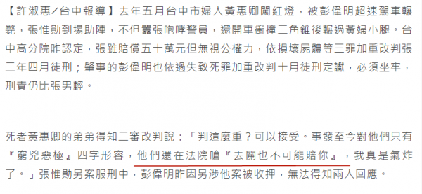 二审判决出来后,车祸事件的受害人家属还爆料彭伟明和张惟勋还叫嚣坐牢也不会赔偿损失。