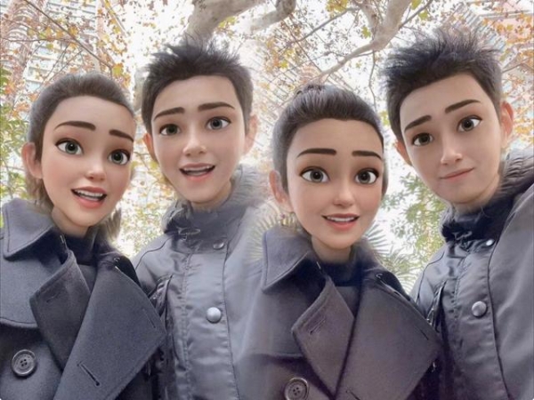 另外两张照片以大树为背景,二人笑出整齐的贝齿,就连漫画版的模样都配一脸。
