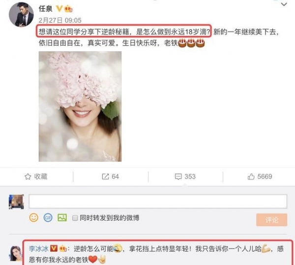 李冰冰之所以发文传授返老还童的方法,是因为任泉在2月27日,也就是5天前,也为李冰冰庆生,并向她请教永远保持18岁的逆龄秘籍,真是太会夸了。