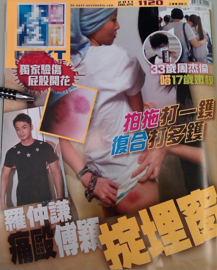傅颖在媒体前,展示自己瘀伤的大腿和臀部。