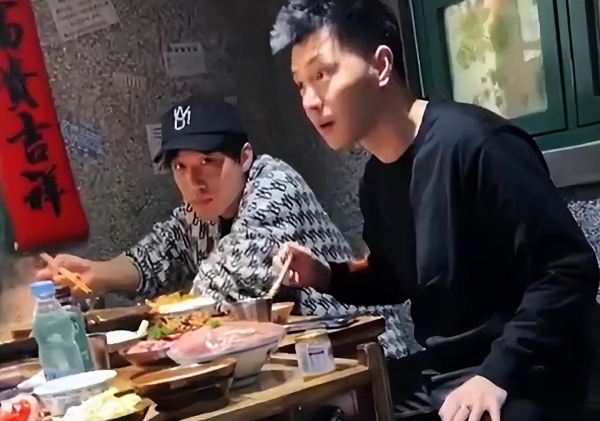 爆料中,何九华的样貌特征非常清晰,头戴黑色鸭舌帽,身穿黑白外套,正夹着火锅料。或许是拍摄者太明目张胆,何九华发现后双目直视着镜头,别说,还真有点小凶。