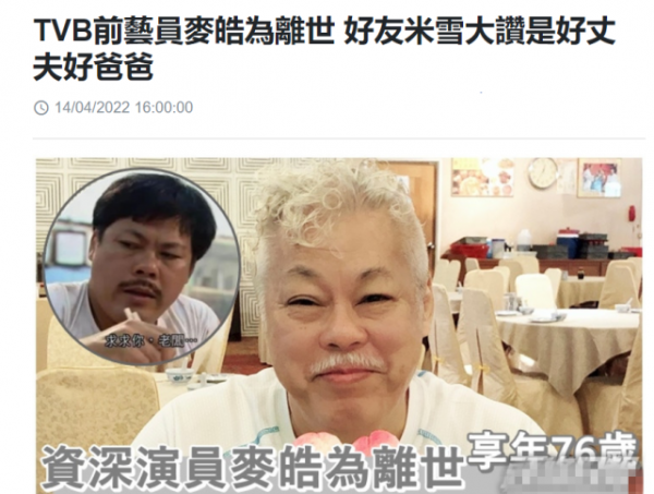 4月14日,据港媒报道,TVB老戏骨麦皓为去世,享年76岁。消息一出,网友们均为之惋惜。