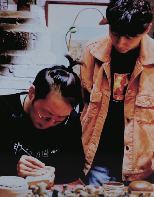 不得不说,杜海涛刻印章真的很专心,和老师学习时全程表现得耐心又细致,而且他还很有创意,在章上刻了一朵小花和一个香蕉,分别代表了刚刚晋升为"妻子"的沈梦辰和自己。