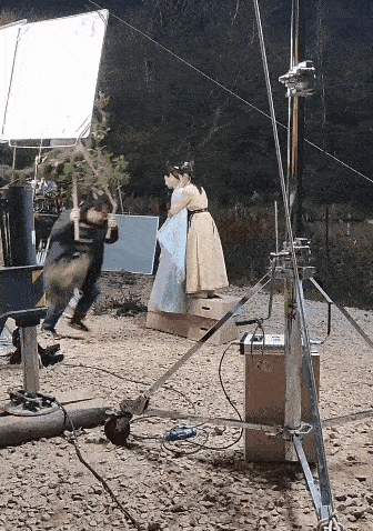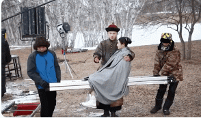 这可苦了演员们,他们只能上半身穿着轻薄飘逸的衬衫拍戏,但镜头往下一扫,底下却是两个工作人员用大棉被紧紧地包裹着两个人。