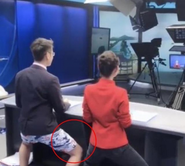 连一向端庄的主播们,夏天的时候,也借着主播台的遮挡偷偷地纳了点凉。在主播台后,不少主播上半身西装笔挺,下半身其实也是穿着短裤在播报。
