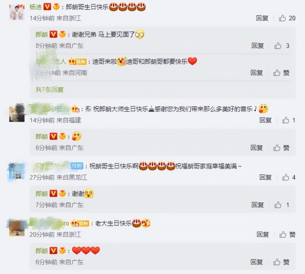 随后杨迪和各路网友纷纷为郎朗送上生日祝福,郎朗本人也一一回复。