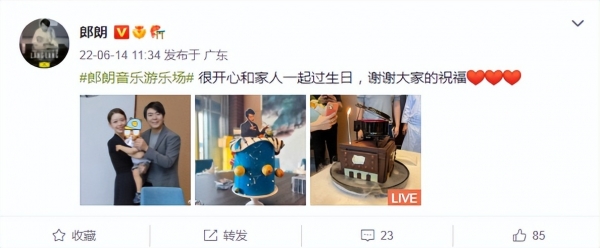 6月14日,钢琴家郎朗罕见在个人社交平台晒出与老婆儿子的温馨合照庆祝40岁生日,他还写道:"很开心和家人一起过生日,谢谢大家的祝福"。