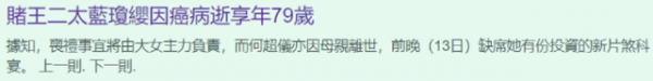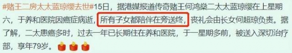 具体细节目前还不得而知,确认消息只有蓝琼缨大女儿何超琼肯定在,她还要负责母亲的丧礼,四女儿何超仪更是直接缺席了活动。
