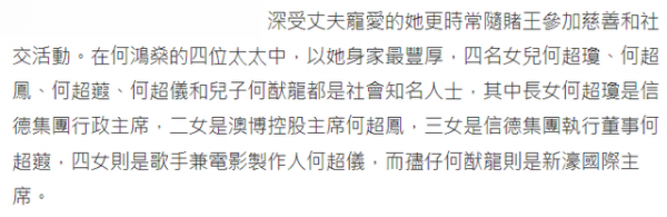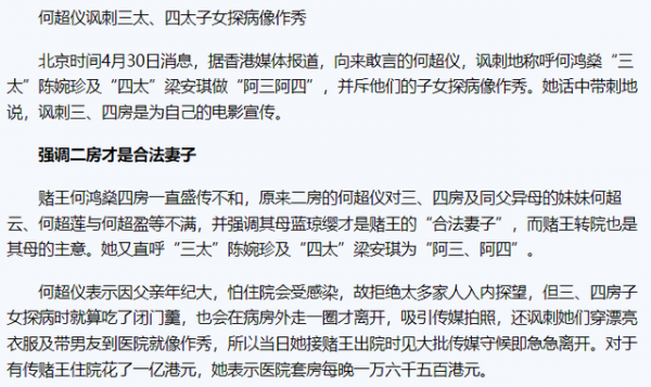 掐指一算何超仪公开嘲讽其他房的事都有十多年了,当时她也是丝毫不给三房四房留面子,后续赌王离世后二房成为最大赢家,不知道她现在有没有心平气和一点,蓝琼缨的5个子女也确实是赌王17个子女中比较优秀的一批。