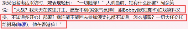 当时正在和欧阳震华拍戏的佘诗曼一脸轻松:大战?我天天在这里开心,感受不到啊。跟bobby(欧阳震华)拍戏笑料多,不知道多开心。"