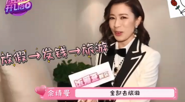 佘诗曼笑着说:"给全国女性放假一个月,发零花钱,让她们去旅游",回答幽默又讨喜。