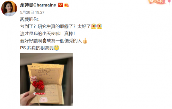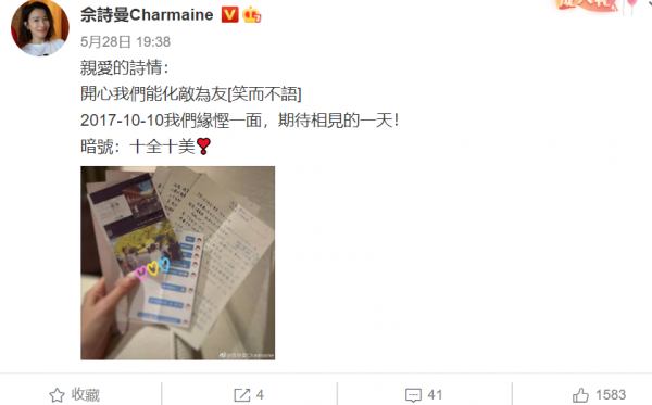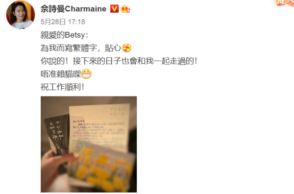 粉丝为了照顾她写的繁体字,佘诗曼体会到了这份贴心。