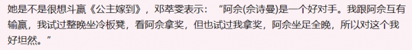 邓萃雯自己也说:我跟阿佘互有输赢,她是个好对手。