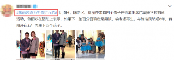 之前她曾说,如果第五胎是男孩,愿意再生拼一把。