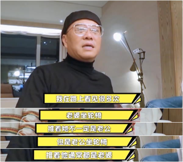 他说根据自己的观察:老公做轮椅,推他的多半是老婆;但老婆做轮椅,推她的却不一定是老公。