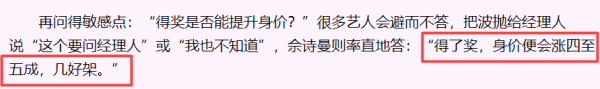 佘诗曼落落大方地告诉查小欣:"得奖身价会提高四五成。"