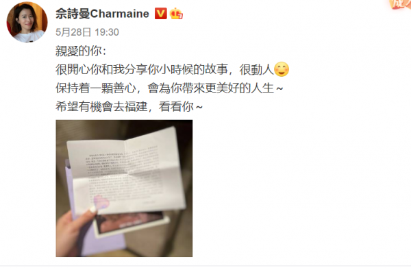 还有感谢粉丝分享小时候的故事,"有机会去福建看看你。"