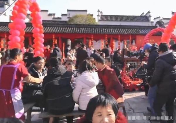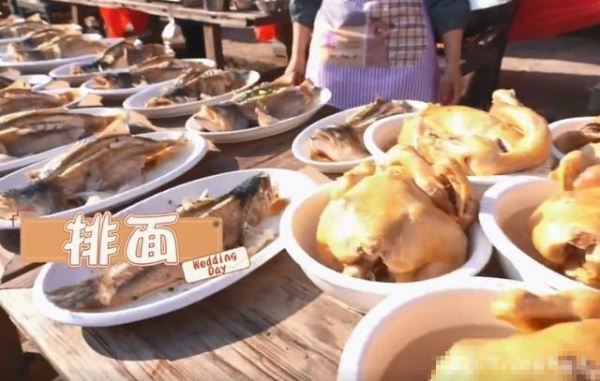 到了婚礼现场,热闹的气氛更足了。关于婚宴,剧组还原的是中国农村特有的露天坝坝宴,十里八村的乡亲邻居都齐聚一堂,现场起码摆了几十桌。大家围坐的也不是什么高级桌椅,就是农村最常见方桌、宽板凳,处处都很接地气。