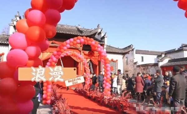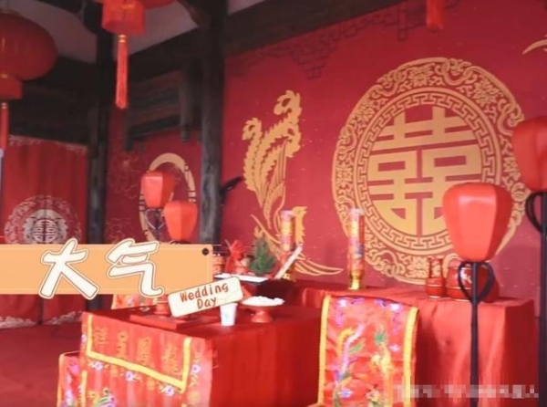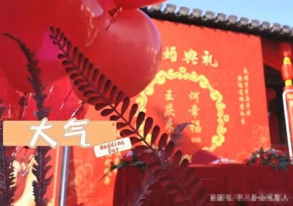 细心观察,这舞台搭建得也很有乡村婚礼的特色。左侧有收礼金的地方,台上有父母见证、喝改口茶的位置。