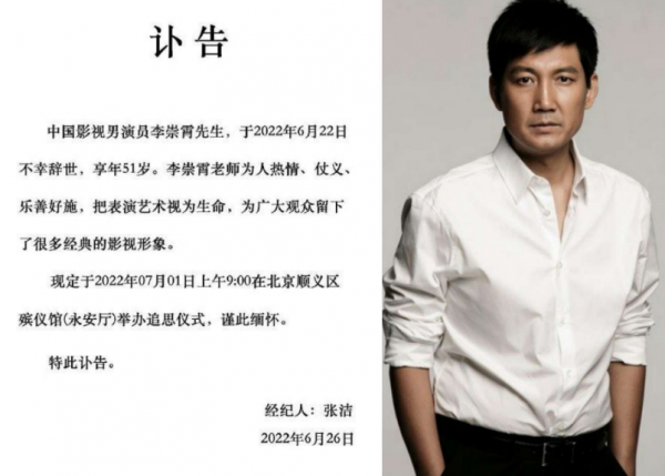 2、戏骨李崇霄意外去世,终年51岁。