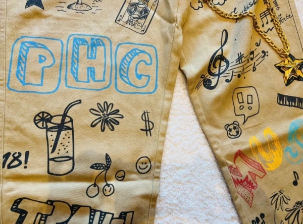 ▲ 特意拍了裤子的大特写,上面都是他最爱的元素:音乐、扑克牌、mojito、还有Phanta Bear(幻想熊)。