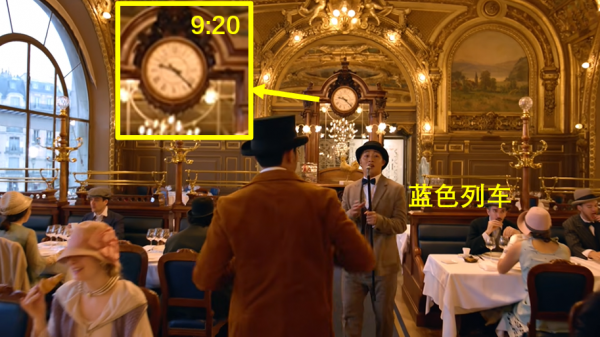 在莎玛丽丹弹钢琴后,杰伦先是在早上9:20穿越到了著名的蓝色列车餐厅。这个9:20正好和1920年呼应。在这里,他给马格利特表演了个球,掰弯了达利的汤匙。