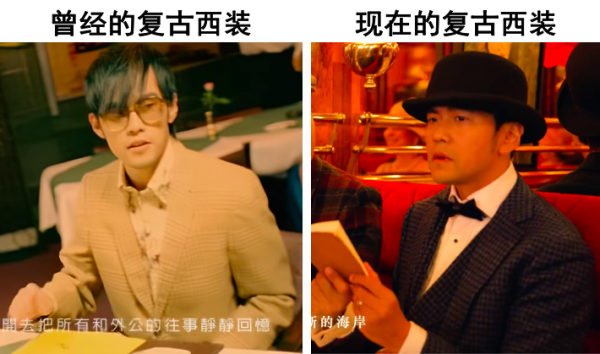 复古西装:04年《外婆》中,杰伦是"我换上复古西装"去给外婆过生日,这回是"哥穿着复古西装"穿越到了1920年。以前是"我换上",现在是"哥穿着",而且现在哥还有帽子搭配着,这就是哥的经济实力吗。