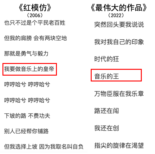 音乐的王:06年《红模仿》中杰伦唱道"我要做音乐上的皇帝",而16年后的《最伟大的作品》中,他说"时代的狂,音乐的王,万物臣服在我乐章"…杰伦牛!