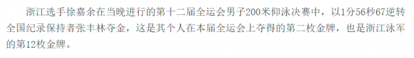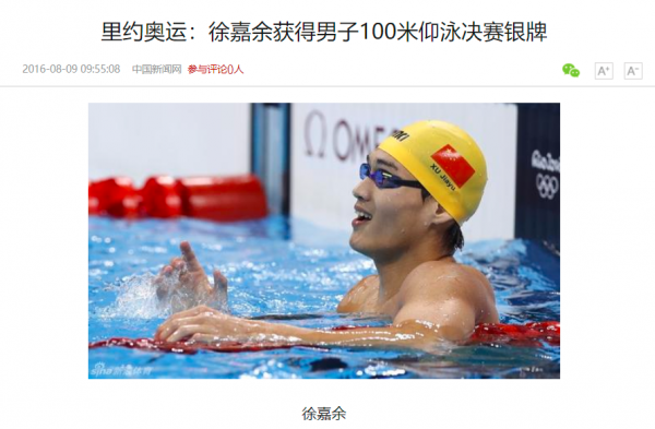 2016年里约奥运会男子100米仰泳决赛中,徐嘉余以52秒31获得亚军,打破了他自己保持的52秒34的全国纪录,并实现了我国男子仰泳在奥运会上奖牌零的突破。