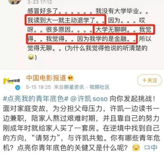 估计许凯退学的时候都没想到自己能这么抢手。至于当初到底为啥退学,许凯说是"学金融无聊",也有消息称他是因为家庭变故,为了分担父母压力辍学。