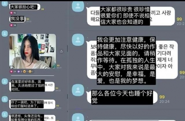 有粉丝发现照片中的韩素希一只眼睛几乎被头发遮挡,眼神飘忽不定,不像正常人自拍时露出五官双眼直视镜头,把照片放大还能看到她另一只眼睛里疑似有几个男人的身影,所以即使韩素希发声报了平安,粉丝们依旧怀疑她背后可能受权贵控制要挟不得不息事宁人。