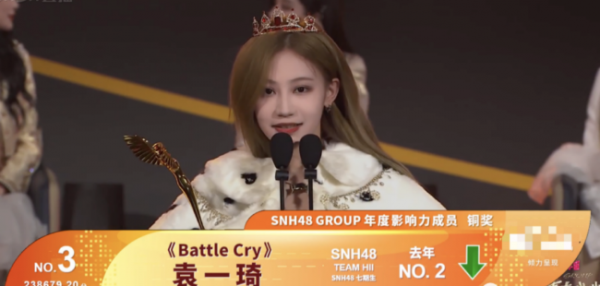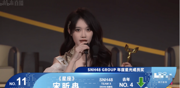 宋昕冉从去年的第4到今年的第11,她说:"去年成绩出来的时候,我就预想到今年会是非常难熬的一个夏天,我不觉得这是失败,这个数字也许会限制住我的脚步,但不能否认我是一个优秀的偶像。"