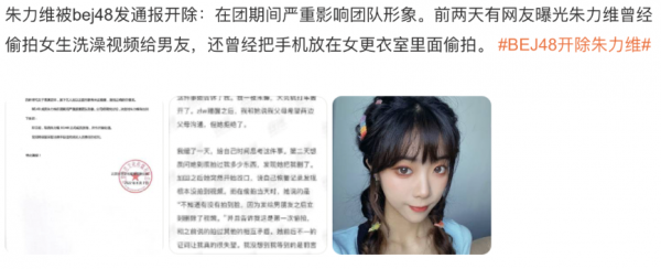 BEJ-48的女团成员朱力维被曝偷拍室友洗澡,并将视频发给了自己的男朋友。
