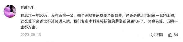网友坦言:"在北京一年20万,没有五险一金,去个医院看病都要全部自费,这还是她北京团第一名的工资,这么算下来还比不过普通人吧。我们专业本科生校招给的薪资都保底10+了,奖金另算,五险一金都齐全。"