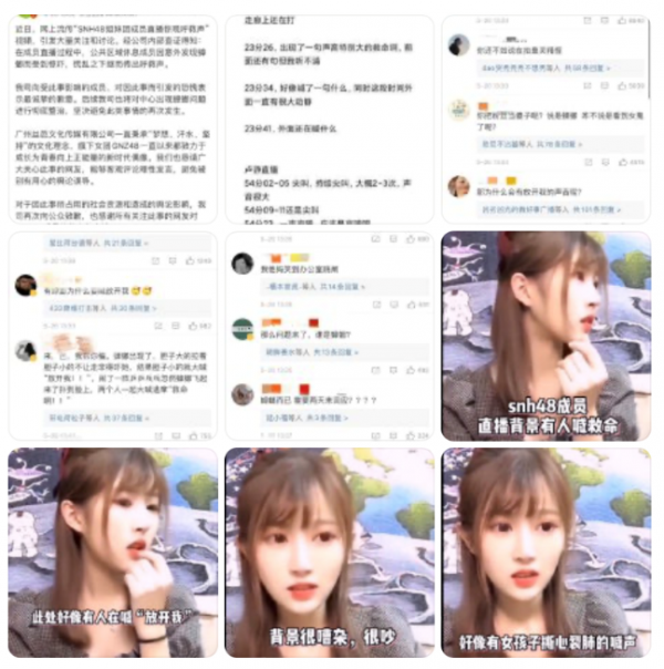 GNZ48的成员卢静在直播时,背景音中出现了其他女孩子喊"救命"的声音,女子一直在大喊:"你有病啊,放开我"。正在直播的卢静一脸尴尬,频频后望,神色紧张。
